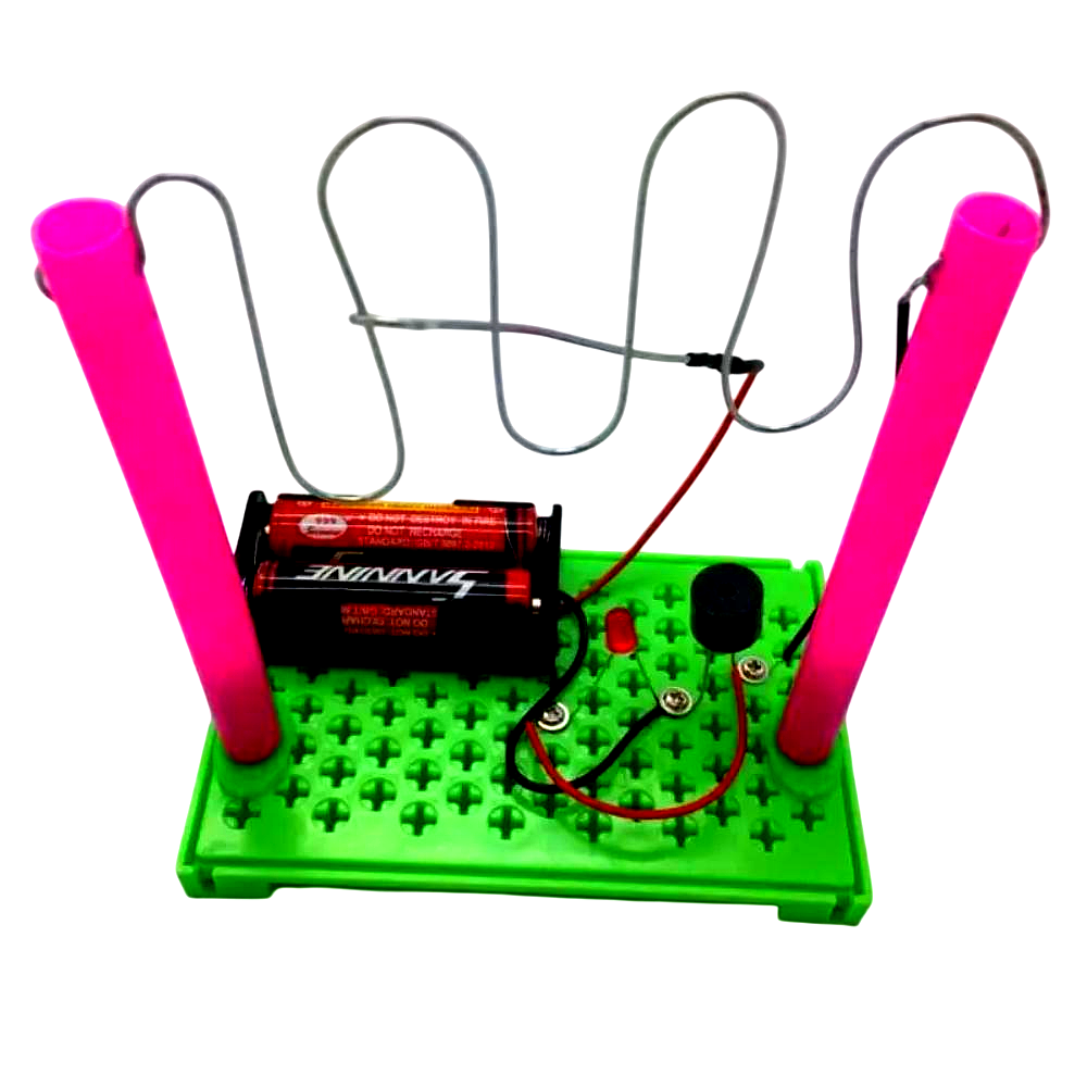 This kit science model works on the principle of open and closed circuits. When the metal ring touches the wire, it completes the circuit, allowing current to flow and activating the buzzer. Avoiding contact keeps the circuit open and silent. This demonstration explains electrical conductivity clearly, similar to practical learning methods used in a biology kit.