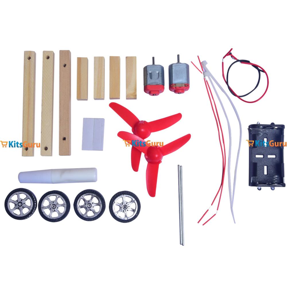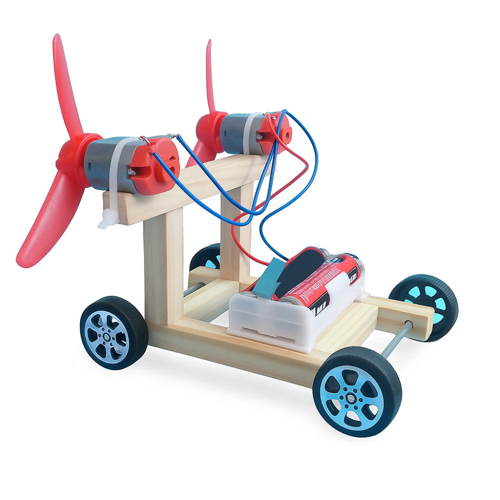 This electric propeller car science project works by converting electrical energy into mechanical energy. When the battery is connected, it powers the two motors, which rotate the propellers to generate thrust. Through this process, learners observe stem types in action while understanding propulsion, aerodynamics, and efficient motor usage.Advantages of This Science Project
