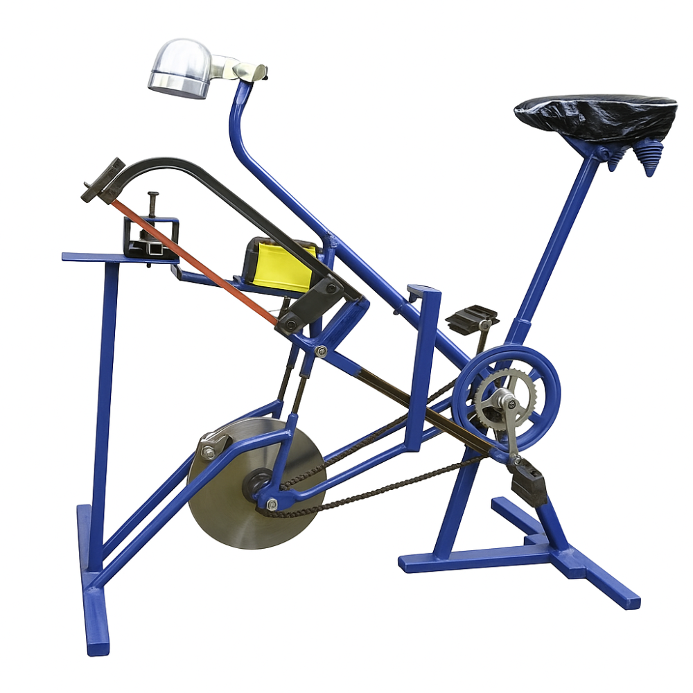 The Bicycle Cutting Machine is a manually operated cutting setup where pedaling action is used to rotate a cutting disc. The operator sits on the bicycle seat and pedals, which turns the crank mechanism. This motion is transferred to the cutting wheel through a chain and sprocket system. As the wheel rotates, it provides the required speed and torque for cutting lightweight materials.