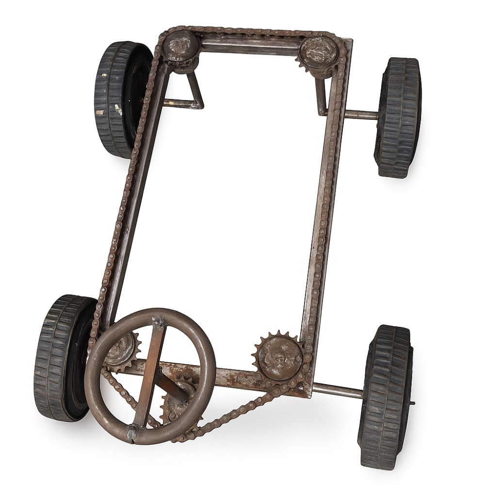 The system has a rigid metal frame that sits on four wheels. Chains, sprockets, and gear linkages connect the steering wheel to the steering arms on each wheel. When you turn the steering wheel, the sprocket-gear mechanism sends synchronized motion through the chain drive, which makes the front and back wheels turn at the same angle. This is like the real-world four-wheel steering technology found in smart cars, forklifts, farm vehicles, and off-road machines.
