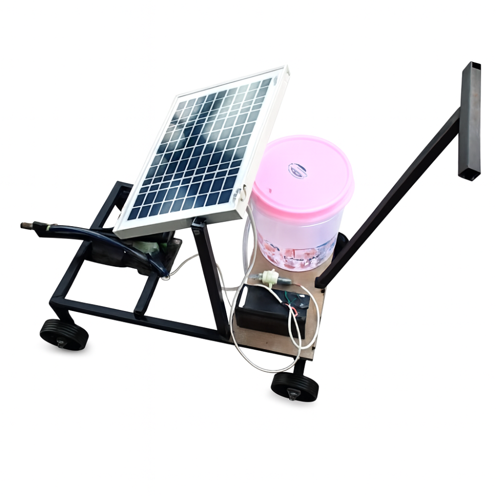 A solar panel in this model turns sunlight into electricity, which then powers a DC pump directly. The pump pulls liquid out of the container and sprays it out of the outlet. This makes it clear how solar power can be used for gardening, spraying, cleaning, and irrigation systems. The model is easy to move and show off at exhibitions because it has wheels and a simple mechanical structure.