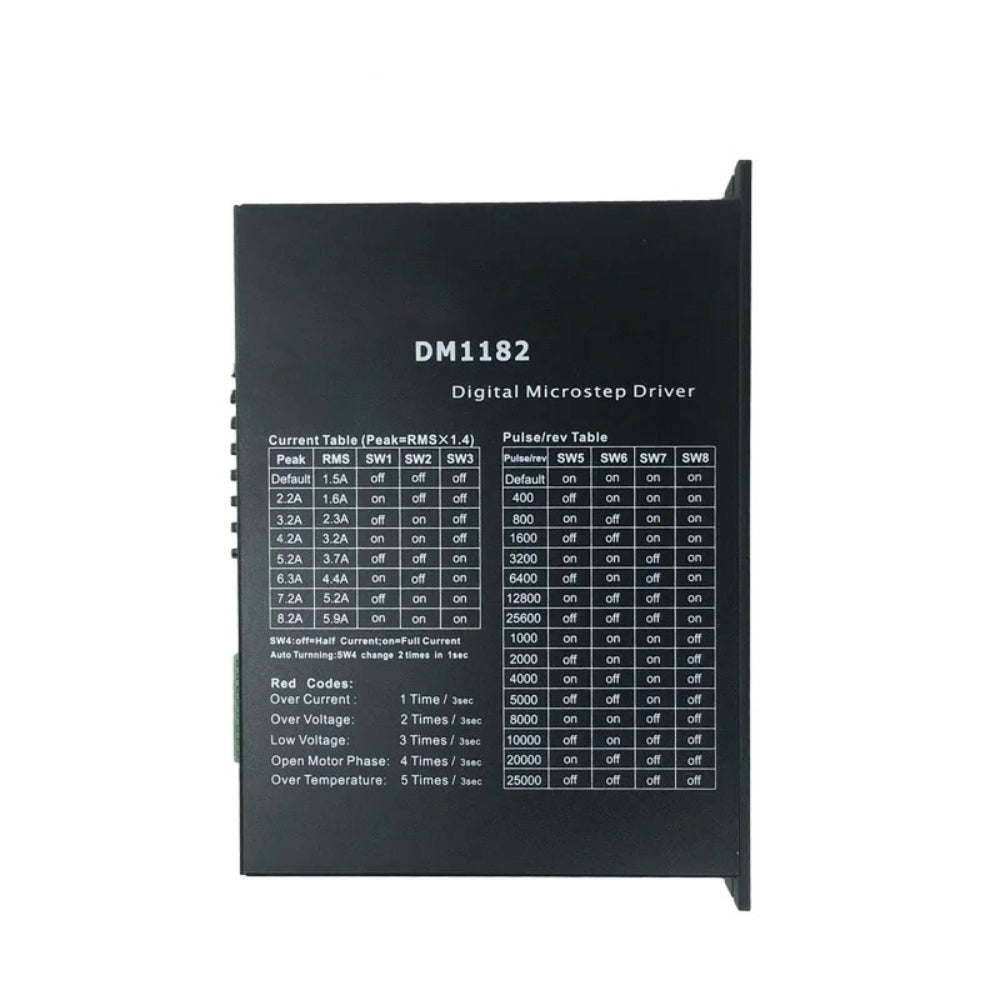 The driver supports direct 110–120V AC input and offers multiple current and microstep settings through DIP switches. With integrated protection features and reliable performance, the DM1182 is ideal for CNC machines, laser systems, and motion-control equipment.