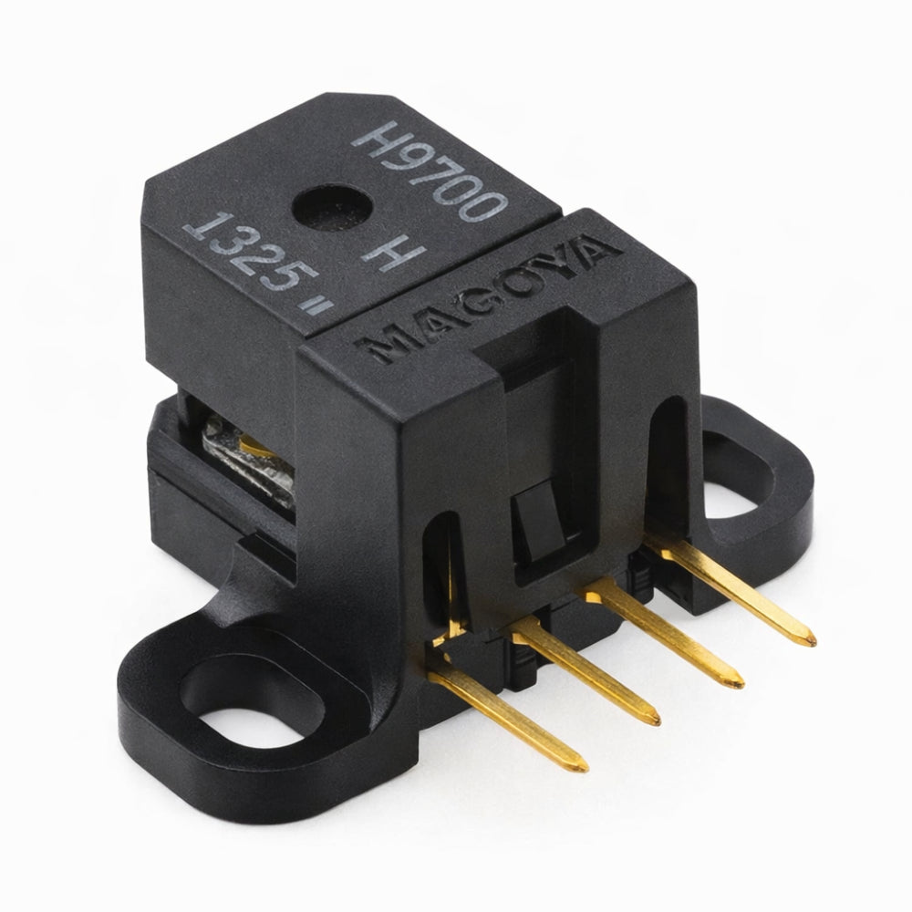 The HEDS-9700 series Sensor Module is a high-performance, low-cost optical incremental encoder designed for accurate rotary and linear position detection. When used with a compatible codewheel or codestrip, this module precisely detects motion and position, making it suitable for industrial, automation, and motion control applications.The module integrates a lensed LED light source and a photodetector IC within a compact C-shaped plastic package. Thanks to its highly collimated light source and unique detector array, the HEDS-9700 offers excellent tolerance to mounting misalignment. It provides two-channel quadrature digital outputs with TTL compatibility and operates from a single 5V power supply.