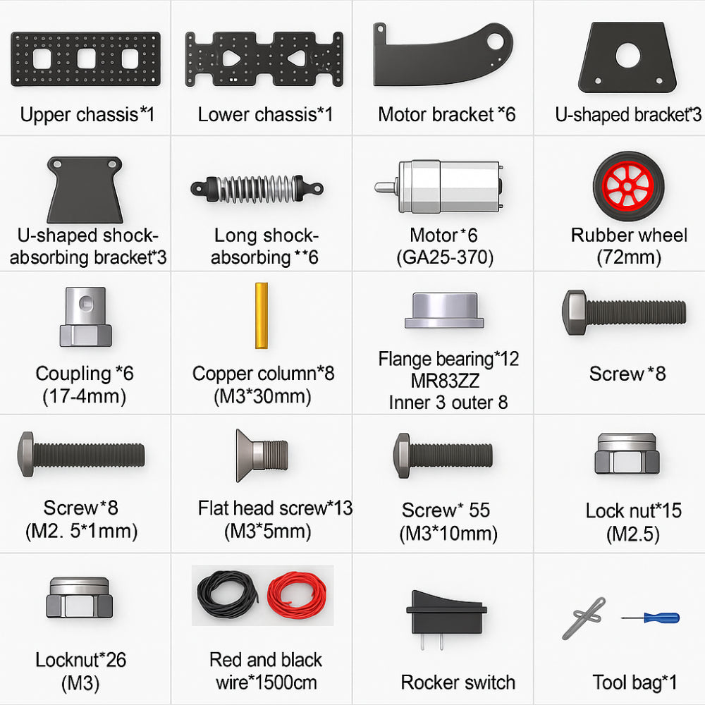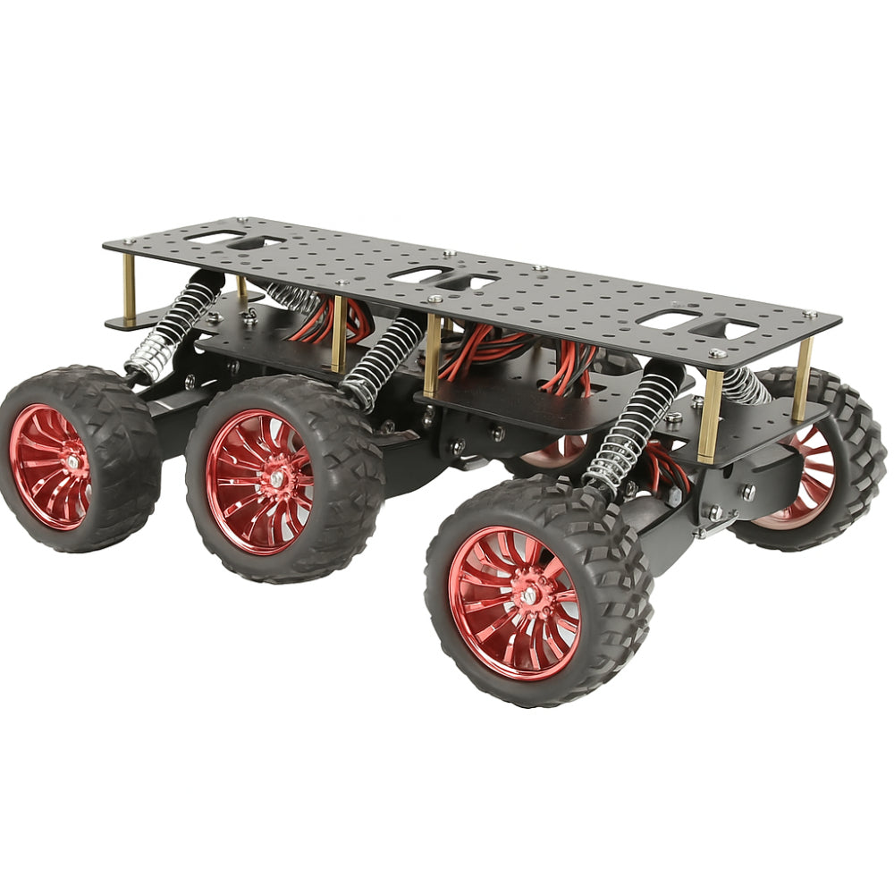 This advanced 6WD platform is ideal for building a powerful remote control robot designed for rugged outdoor environments. Its durable aluminum structure also makes it suitable for serious robotics projects, especially where off-road strength and stability are required. Because many users search for a robotics shop near me for high-quality frames, this chassis offers a premium alternative with strong construction and modular expandability. As a result, the remote control robot you build will handle climbing, uneven terrain, and high-load operation reliably.The chassis includes a robust 2mm stamped base with aluminum plating, supporting sensors, controllers, and accessories for a customized remote control robot design. With its six metal shock absorbers, the platform reduces vibration and improves traction, making it a reliable foundation for robotics projects involving rough terrain. Its dual-layer mounting structure is engineered to streamline installation and provide the flexibility needed for a versatile remote control robot setup.