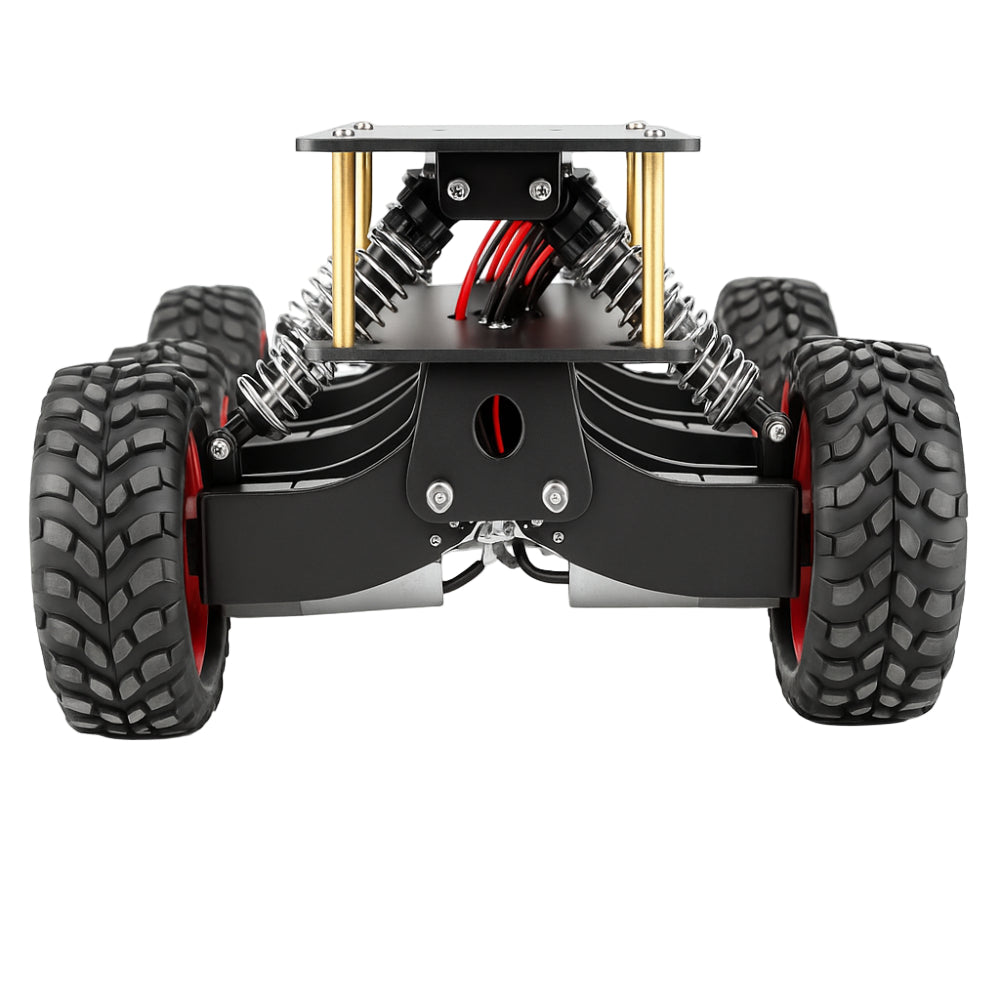 The chassis includes a robust 2mm stamped base with aluminum plating, supporting sensors, controllers, and accessories for a customized remote control robot design. With its six metal shock absorbers, the platform reduces vibration and improves traction, making it a reliable foundation for robotics projects involving rough terrain. Its dual-layer mounting structure is engineered to streamline installation and provide the flexibility needed for a versatile remote control robot setup.