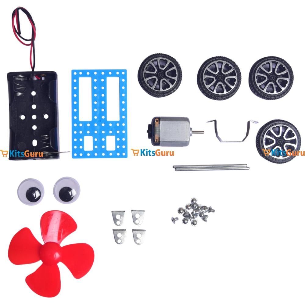 - DC Motor – Powers the fan for additional propulsion and motion.