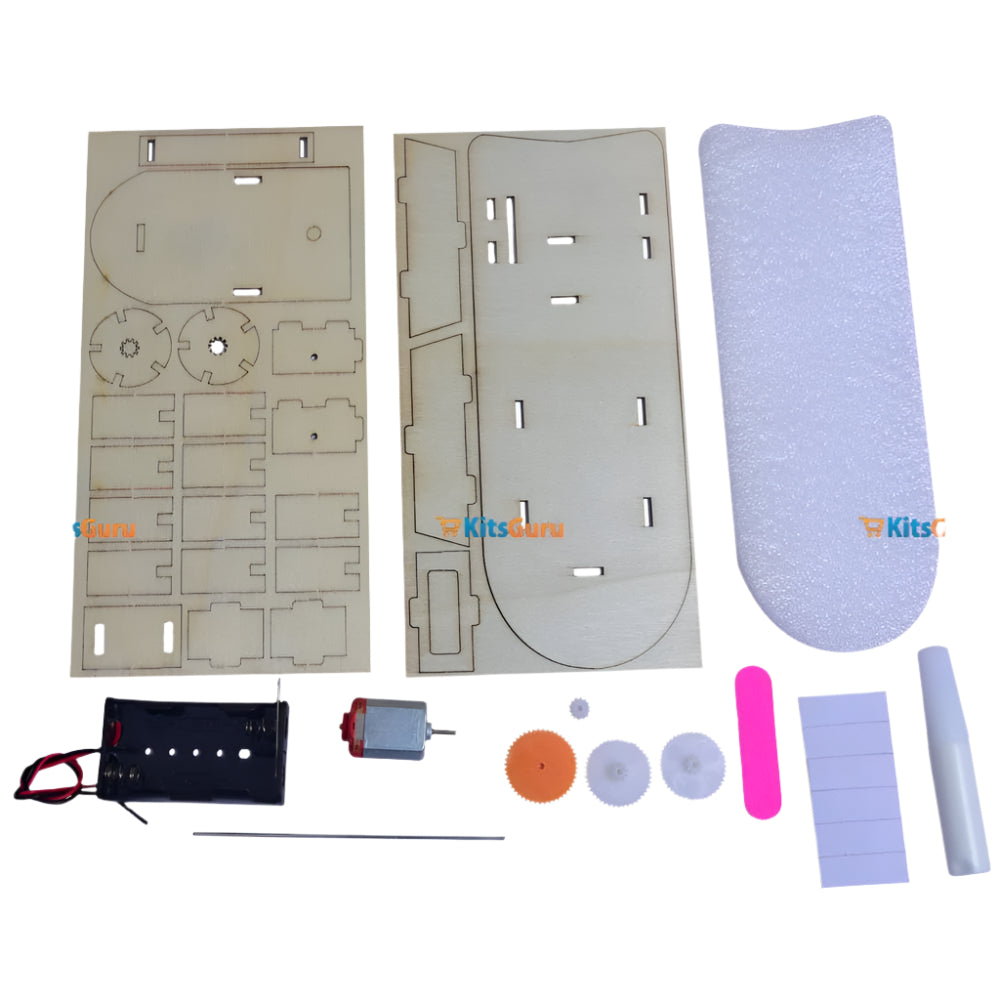 This DIY double-propeller speed boat toy is a creative STEM learning model designed as a battery for science project that helps students understand propulsion, buoyancy, and motion. Made from precision-cut wooden parts, it is ideal as an experiment for science exhibition, where learners explore real-world mechanics through hands-on assembly. This interactive kit turns electrical energy into visible motion, making learning practical and exciting from the very first build.Materials and User Manual