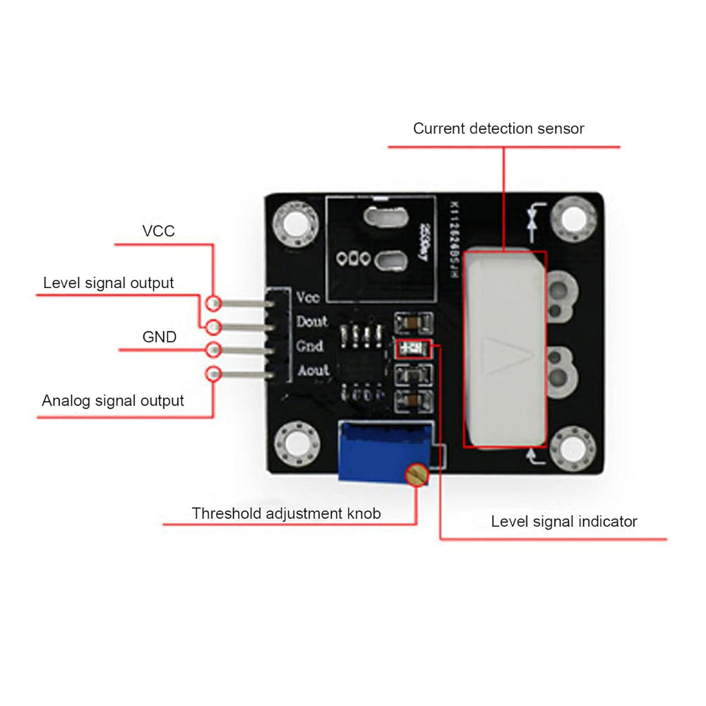 This module features a precise, low-temperature drift linear Hall effect sensor IC with a built-in temperature compensation circuit and a 9.0 mm through-hole for current flow. The current-carrying wire can pass through this hole, allowing accurate measurement of the magnetic field generated by the current. The sensor converts this magnetic field into a proportional analog voltage output, providing high accuracy and stable performance.