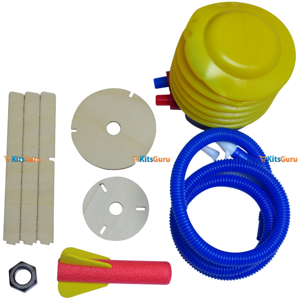 This inflatable launcher demonstrates how air pressure creates motion in a controlled system. When the pump is pressed, air rushes into the base and propels the rocket upward. Through this rocket science project, learners clearly observe Newton’s Third Law and the relationship between force, pressure, and movement.Advantages of This Science Project