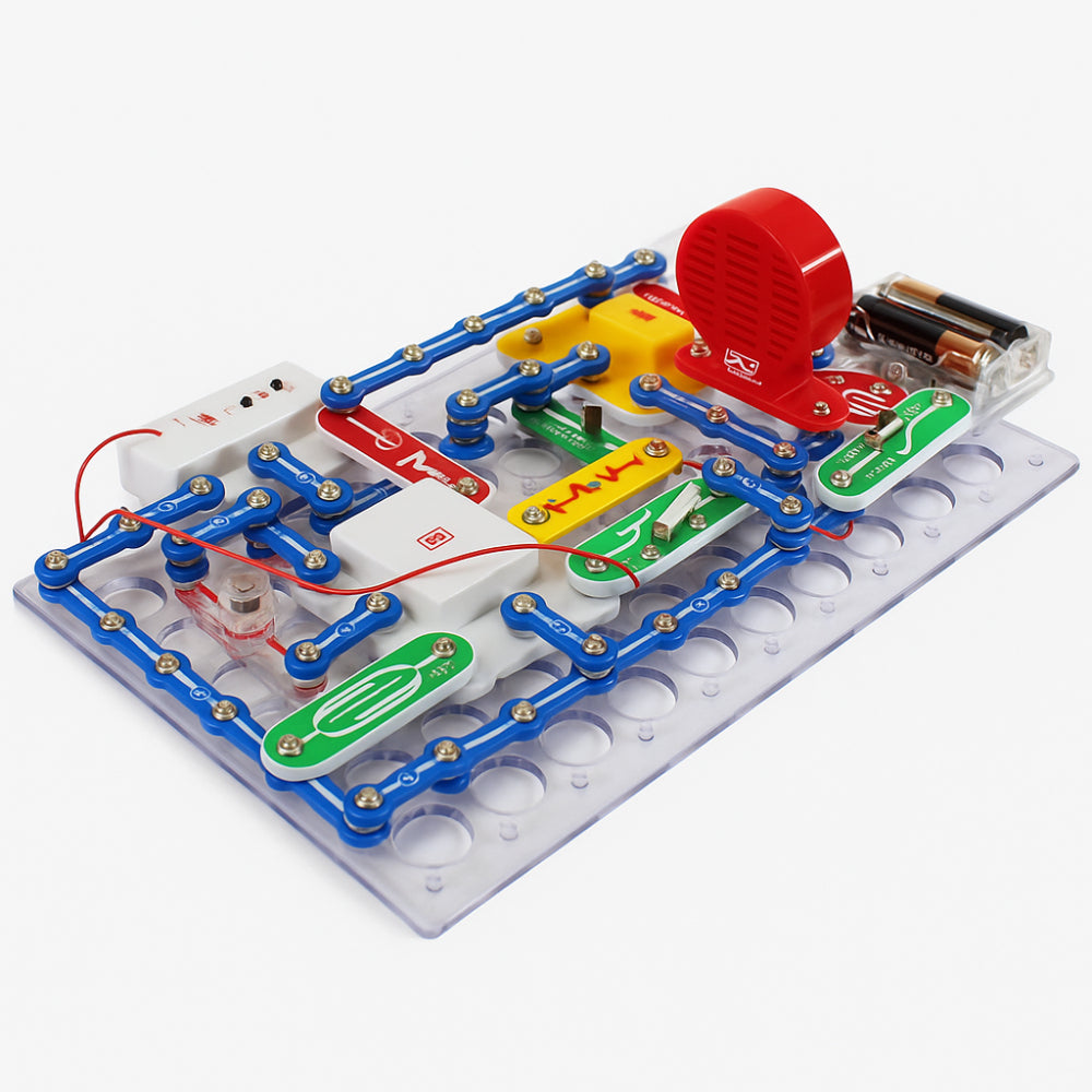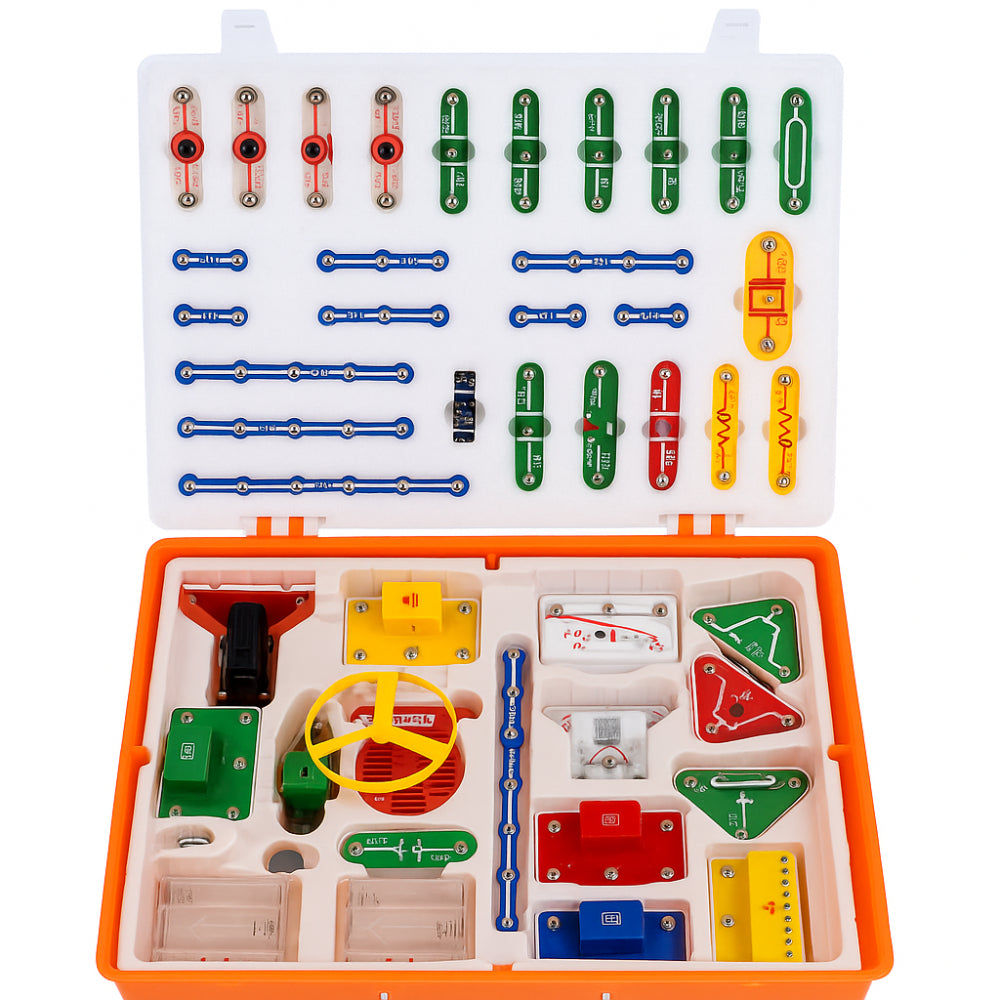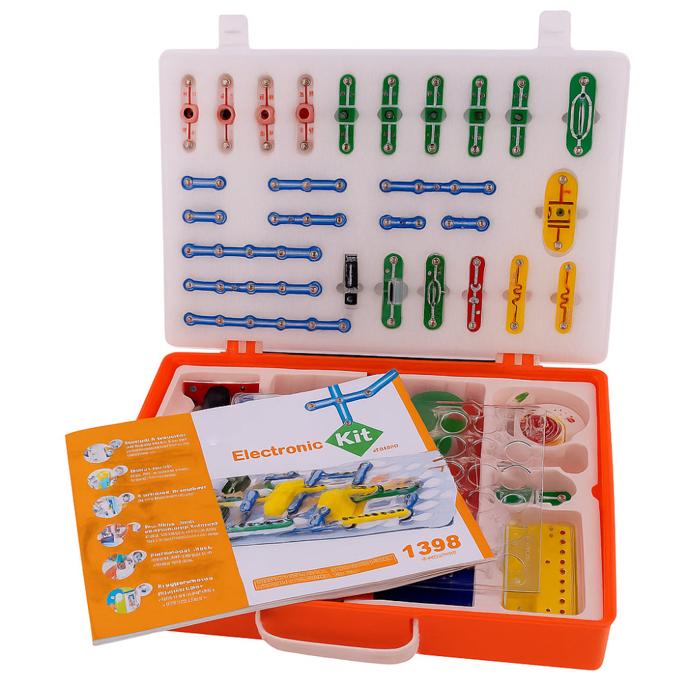 The 1398 Experiments SNAP Circuits STEM Electronics Kit is a premium educational electronics lab designed to help children explore the principles of electricity, circuits, sensors, motors, switches, and sound. With an impressive collection of 1398 hands-on experiments, students can build real electronic models using safe, snap-together parts—no soldering or tools required.This suitcase-style kit includes advanced modules like hand-crank generator, noise detector, alarm clock circuit, sound-controlled doorbell, soil-humidity tester, and music radio station. It is perfect for STEM labs, robotics classes, science fairs, home learning, and project-based education.