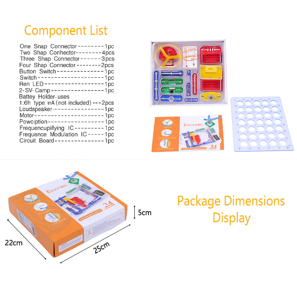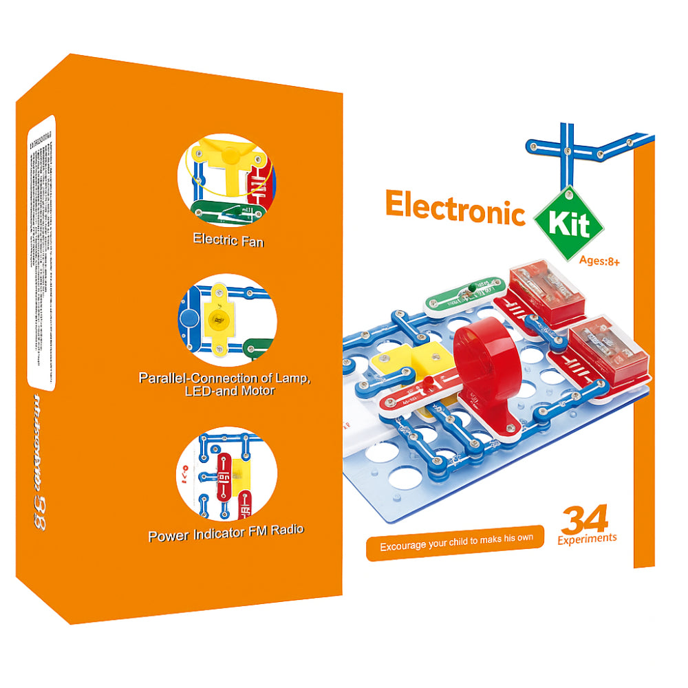 The Electronic Kit Model 34C is a versatile STEM learning kit designed to introduce children to the fundamentals of electricity, circuits, motors, LEDs, and radio systems. With 34 interactive snap-circuit experiments, students can build real working models using safe, modular electronic components—no soldering or tools required.