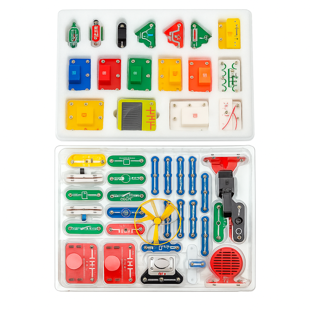 The 3198 Experiments Snap Circuits Kit is one of the most advanced and comprehensive STEM electronics learning systems ever created. Packed inside a premium aluminum suitcase-style box, this kit allows children and hobbyists to explore Basic circuit of LED Magnet-controlled LED, Button-controlled fan , Hand crank fan , Flying saucer , Solar lamp , Magnet-controlled solar LED , Parallel series connection of resistors , Voltage division tester, and hundreds of other real working electronic projects.