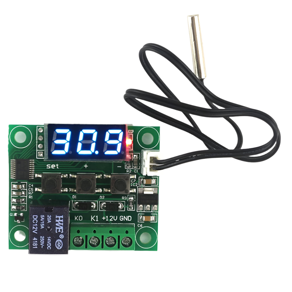 This versatile module is widely used as a w1209 digital temperature controller and offers precise temperature management with an easy-to-read display. It integrates smoothly into automation, incubation, and DIY systems, and due to its flexible settings, the module also works well as a thermostat w1209 replacement while supporting users who need clear insight into w1209 temperature controller price performance. With accurate sensing and adjustable parameters, it ensures stable control across many temperature-regulated projects. This XH W1209 12V Digital Temperature Controller includes an NTC sensor and a 7-segment display. The module features a keypad for configuring temperature parameters and offers an impressive accuracy of 0.1°C. Designed for flexibility, the w1209 digital temperature controller intelligently manages power delivery to connected devices based on real-time readings from its high-accuracy NTC probe. The onboard LED shows relay status, allowing quick system monitoring.Technical Details