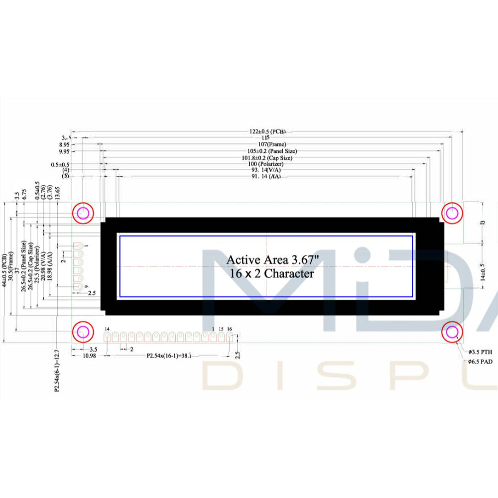 The Midas 1602 Character OLED Display is a high-contrast, sunlight-readable red OLED module designed for embedded, industrial, and educational systems. Featuring a 16×2 character layout with SPI serial interface, it delivers superior readability, energy efficiency, and wide temperature tolerance. It serves as a drop-in mechanical replacement for standard 1602 LCDs and is fully compatible with Arduino, Raspberry Pi, and other microcontroller platforms.General Specifications