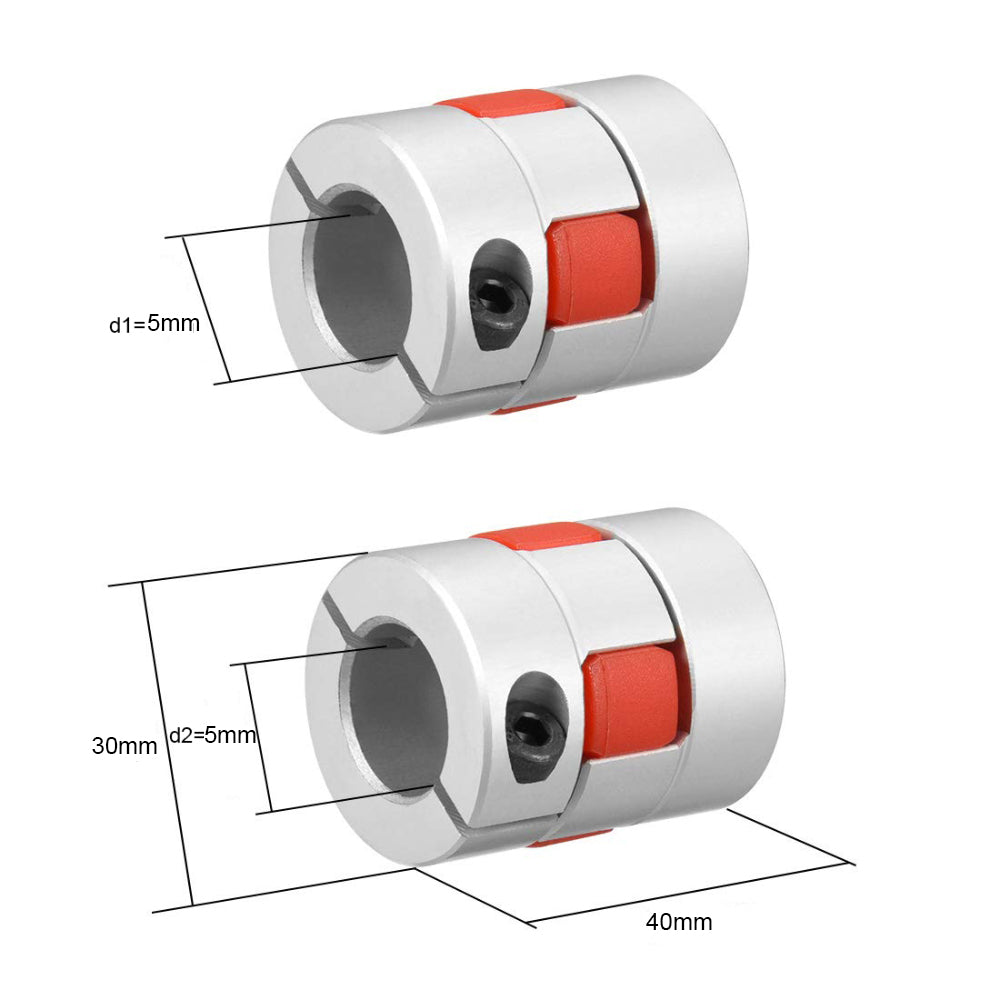 Made from high-quality aluminum alloy, this flexible spider jaw coupling helps absorb vibration, reduce shock, and compensate for slight shaft misalignment. The 30 × 40 mm series is available in a 5mm to 16mm bore range, but this particular variant comes with d1 = 5mm and d2 = 5mm. It is a practical choice for compact transmission systems requiring smooth rotation, dependable performance, and high-speed operation.