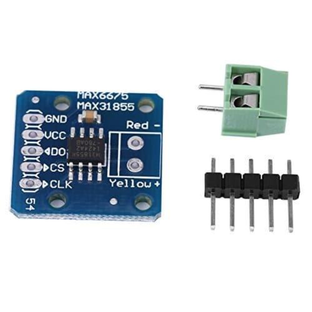 The MAX31855 K-type Thermocouple Module is designed for precise temperature measurement using a K-type thermocouple. It includes a cold-compensation reference, 3.3V regulator with bypass capacitors, and level shifting circuitry, allowing easy interfacing with any microcontroller, even those without analog inputs. The module comes with a 2-pin terminal block for the thermocouple and a pin header for easy breadboard or perfboard integration.This module supports -200°C to +1350°C measurements in 0.25-degree increments, and also provides internal temperature reading. It works with any K-type thermocouple and requires only 3 digital I/O pins for SPI communication. With 3.3–5V power supply compatibility, it is ideal for industrial, DIY, and embedded electronics projects.