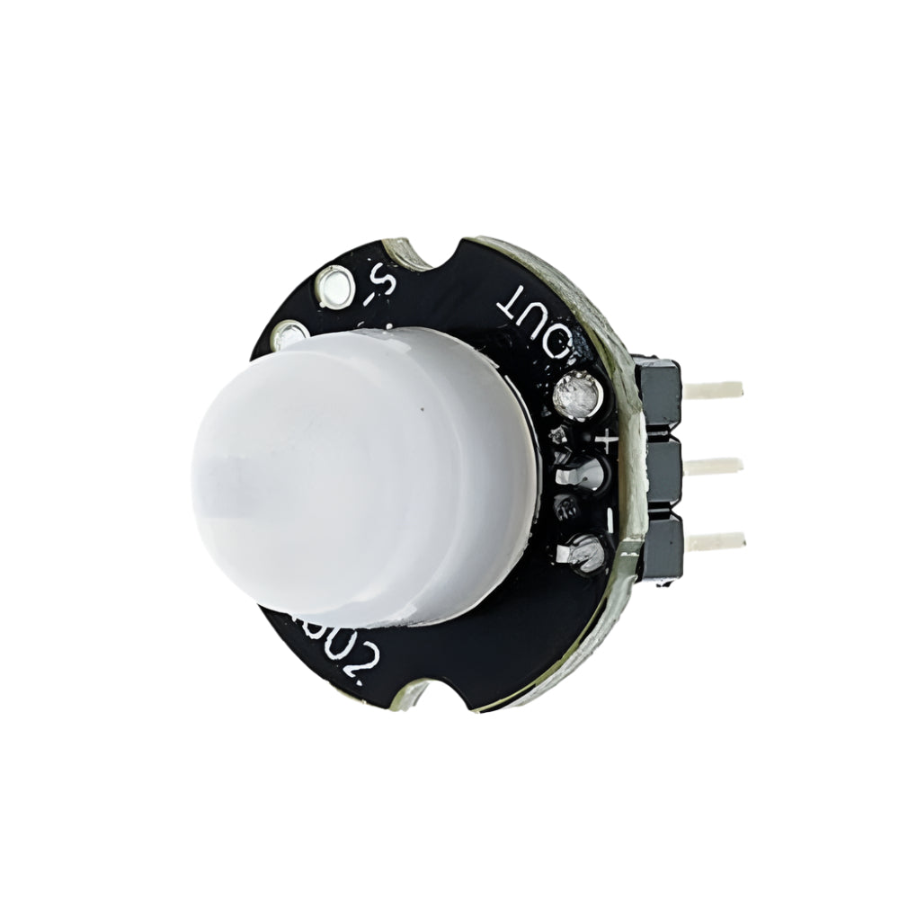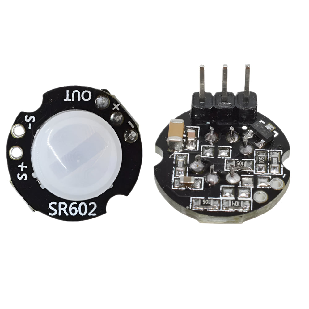 MH-SR602 MINI Motion Sensor Detector Module is a Pyroelectric human-body infrared sensor module designed for Arduino and other microcontroller projects. With a sensing distance of up to 5 meters, it is perfect for motion detection-based automation and security projects using a pir arduino setup. It also works effectively as a pir motion detector sensor module in home safety systems. Thanks to its compact size and low power needs, it supports reliable performance in pir sensor types based on infrared detection.Note: The high-level output time of this product is adjustable — from about 2.5 seconds up to 1 hour (factory default: 2.5 seconds). You can change this by replacing one chip resistor (refer to delay chart for exact timing).
